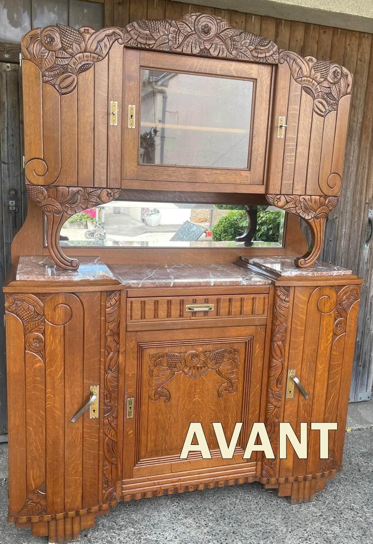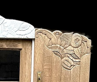 Bref, un buffet art nouveau, deux corps, en chêne, auquel j’espère avoir redonné joie de vivre… en notre époque !