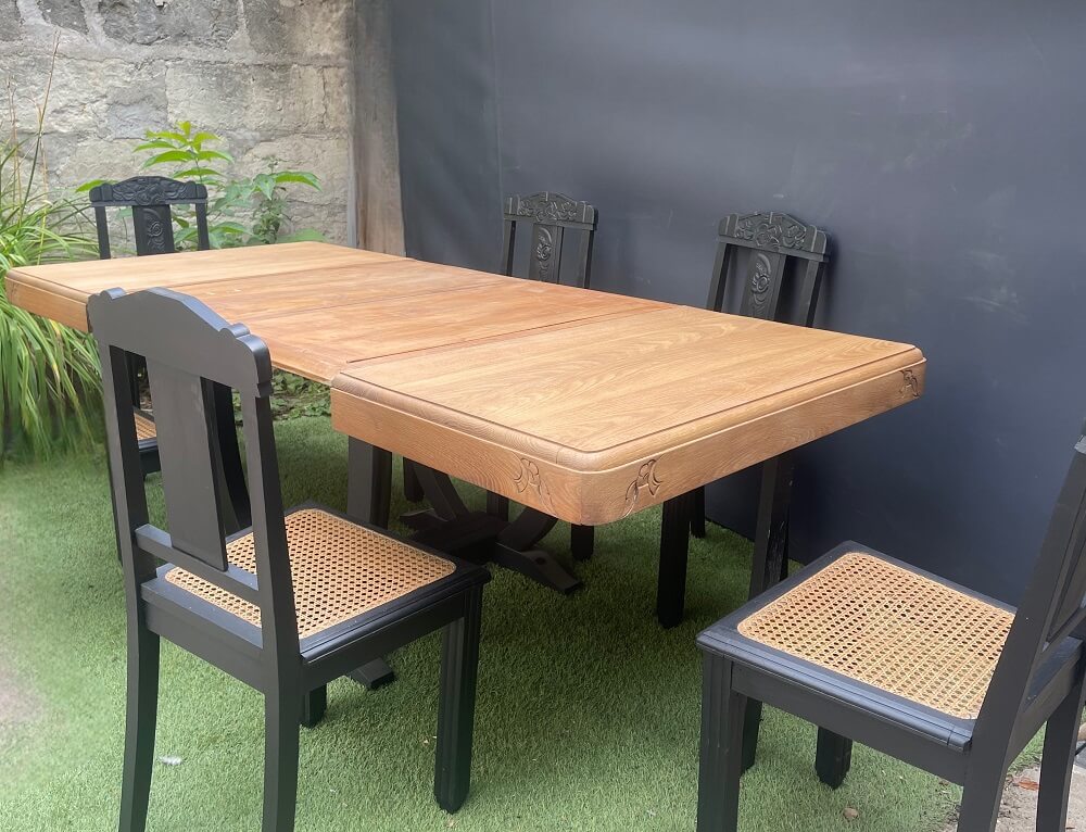 Nous sommes donc bien avec un ensemble composé d’une table art nouveau, avec rallonges, et de ses six chaises.